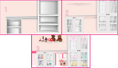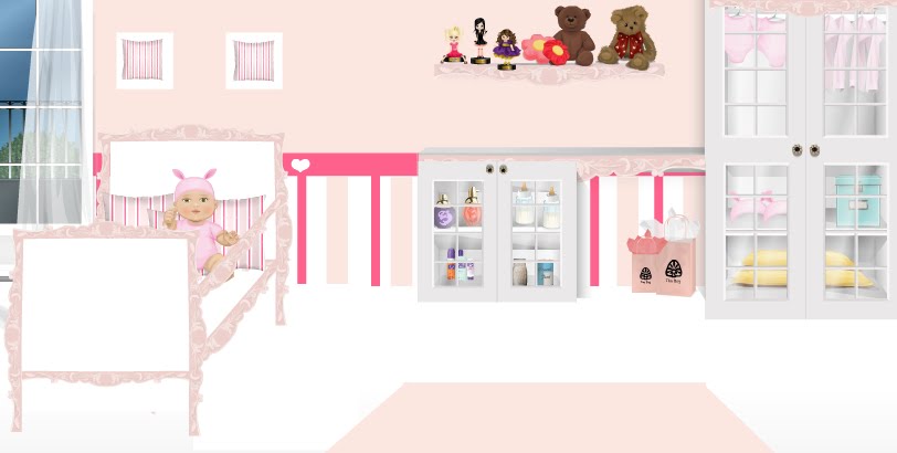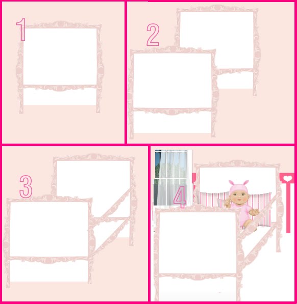 1: Use o quadrado do desenhe decoração para fazer o berço. coloque as prateleiras rosa.